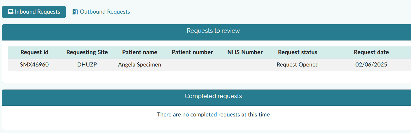 - Under the 'Inbound Requests' tab you'll see 2 tables of requests to review and completed requests. Click any row to open the corresponding request